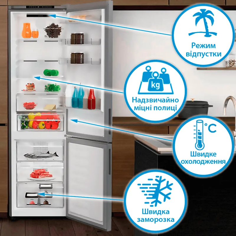 | Функції | Швидка заморозка, Режим Еко, Режим відпустки, Сигнал відкритих дверцят |