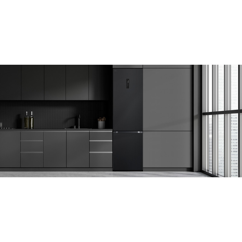Сучасний холодильник з об’ємом 384 л, нижньою морозильною камерою на 107 л і тихою роботою (35 дБ). Інверторний компресор і технологія Total No Frost забезпечують ефективне охолодження без інею. Оснащений DoorCooling+, зонами свіжості Fresh Balancer і Fresh Converter, Wi-Fi-керуванням LG ThinQ, дисплеєм, LED-підсвіткою та складаною полицею. Енергетичний клас A++, споживання – 288 кВт/рік.