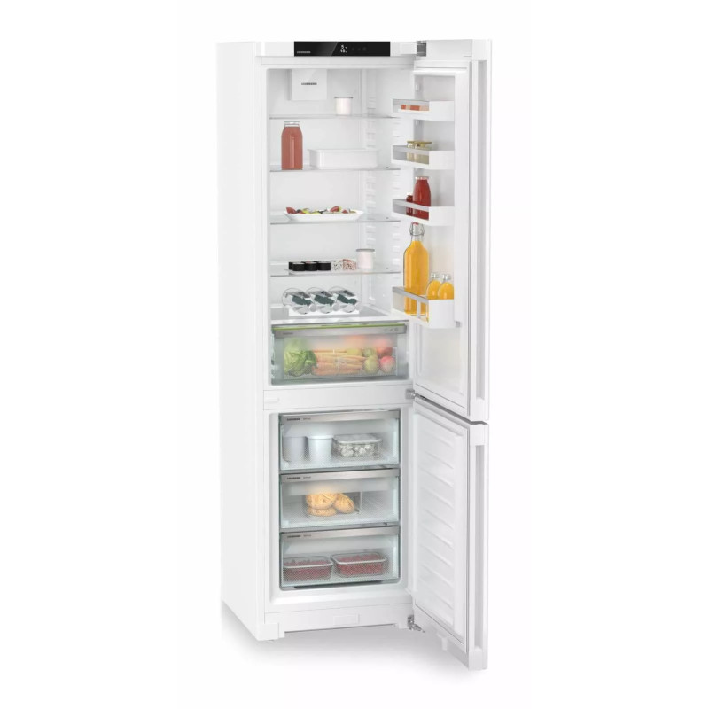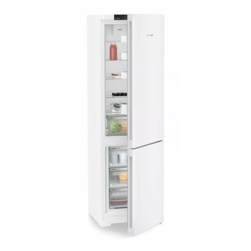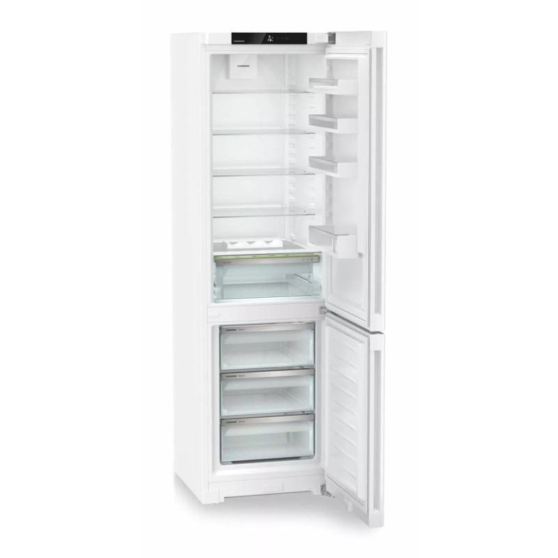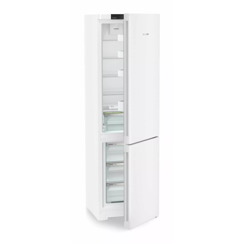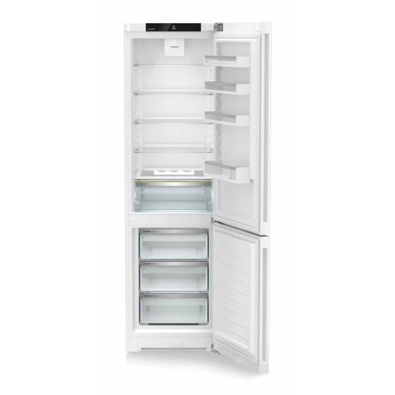 Двокамерний холодильник Liebherr CND5703 — це сучасна модель з об'ємом 360 літрів, яка поєднує в собі високу енергоефективність та інноваційні технології для зберігання продуктів. Холодильник має систему NoFrost, яка усуває потребу в ручному розморожуванні, а технологія DuoCooling забезпечує незалежне керування температурою в холодильній і морозильній камерах, що запобігає змішуванню запахів. Інші корисні функції включають SuperCool і SuperFrost для швидкого охолодження та заморожування, а також відділення EasyFresh, яке зберігає свіжість овочів і фруктів.
