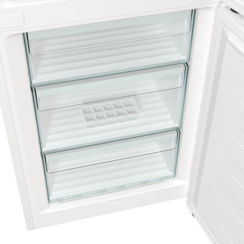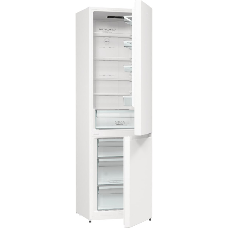 Холодильник Gorenje NRK6202EW4 - це двокамерний пристрій з загальним об’ємом 331 літр. Він оснащений технологією NoFrost Plus, яка запобігає утворенню льоду і спрощує догляд. Система IonAir з MultiFlow 360° забезпечує ідеальний мікроклімат на кожній полиці, зберігаючи свіжість продуктів. Завдяки функції AdaptTech, холодильник автоматично регулює температуру в залежності від частоти відкривання дверей. Крім того, він має низький рівень шуму - всього 38 дБ. Холодильник також оснащений великим ящиком для овочів і фруктів, що допомагає зберігати їх свіжими довше.