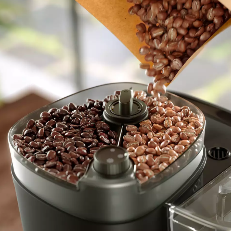 Знімний подвійний контейнер із технологією Aroma Seal дозволяє зберігати та змішувати два види змеленої кави. Він також дозволяє перемикатися між кавою без кофеїну та звичайною кавою. Його легко чистити завдяки щітці, що надається в комплекті, а також повторно наповнювати.
