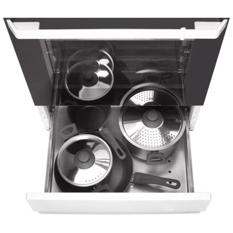 Електрична духовка об'ємом 62 л забезпечена решітчастими напрямними, в які ідеально поміщаються аксесуари: решітка для рум'яних страв-гриль, плоске деко для запашної домашньої випічки та глибоке - для соковитих м'ясо-рибних виробів. Зберігання всіх комплектуючих можливо в спеціальному висувному ящику під духовою шафою. Камера забезпечена декількома корисними функціями, що полегшують експлуатацію. Так, режим термостата забезпечить підтримання високої температури всередині духовки та страва не охолоне, що дуже зручно, якщо гості затримуються. Функція конвекції гарантує постійну циркуляцію гарячих потоків повітря всередині камери, за рахунок чого можна готувати відразу декілька страв на різних рівнях одночасно. При цьому запах і смак кожного виробу залишаються незмінними. Контролювати процес приготування дозволяють прозорі дверцята з пари жаростійких стекол і підсвічування в духовці. Можливість встановлення таймера звільнить від необхідності постійного контролю, оскільки духова шафа просигналізує про закінчення циклу.