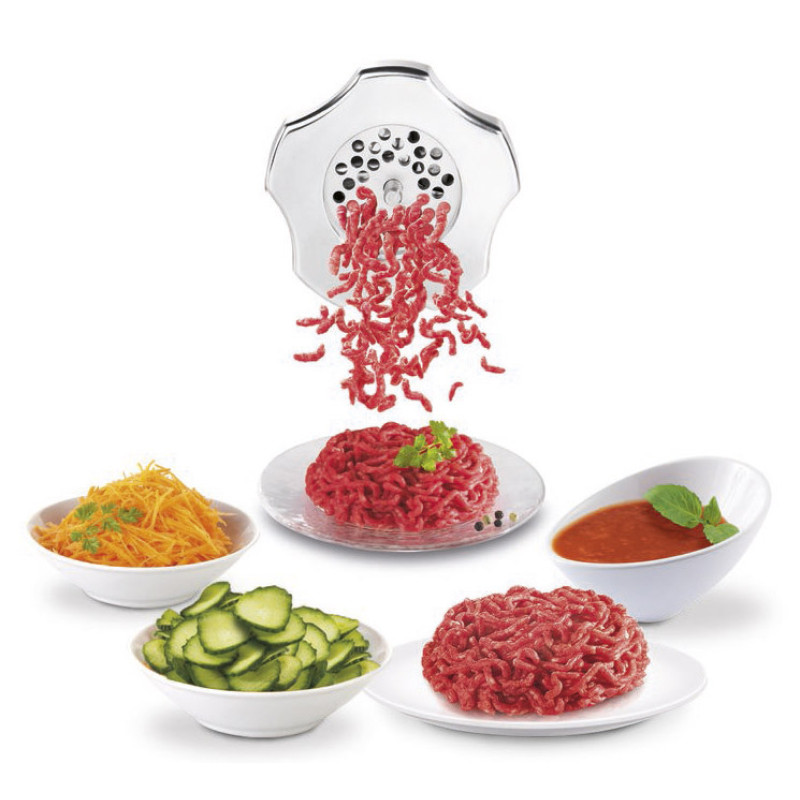 Модель є універсальним помічником завдяки багатофункціональним насадкам: барабанам для подрібнення і нарізки, насадці для соусів, насадкам для формування шашликів і ковбас.