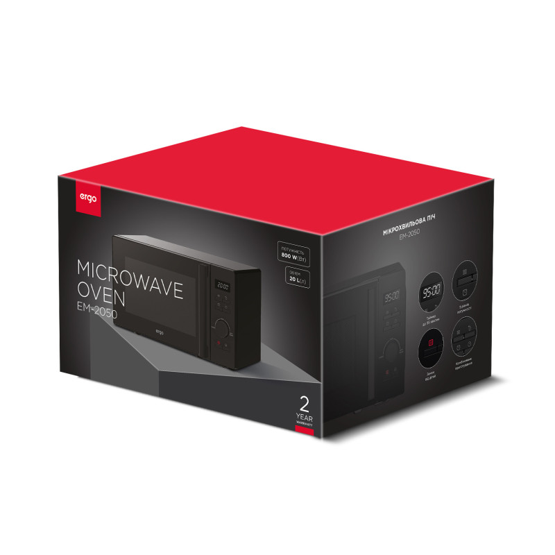 Завдяки звичній і інтуїтивно зрозумілій системі керування будь-яка функція в печі ERGO EM-2050 запускається буквально одним дотиком. Кнопки та колесо дозволяють обирати й налаштовувати режими і час роботи, відображаючи інформацію на зручному світлодіодному дисплеї.