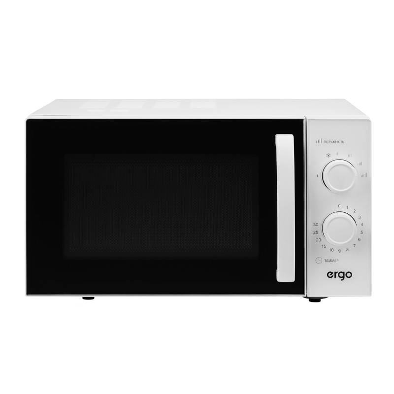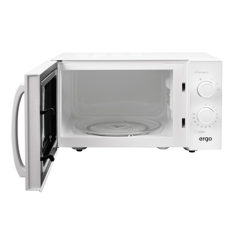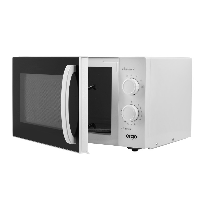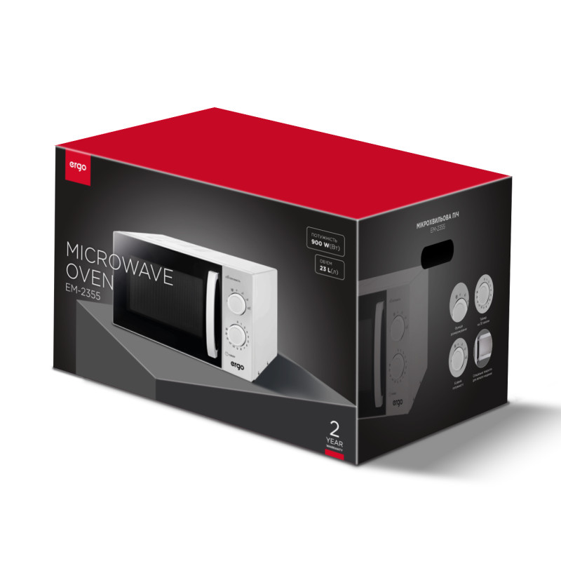 ERGO EM-2355 – це сучасна мікрохвильова пічка в універсальному білому кольорі з доволі містким внутрішнім простором 23 літри, діаметром поворотного столу 27 см і значною потужністю 900 Вт, яка швидко та рівномірно розігріє або розморозить великі порції продуктів.