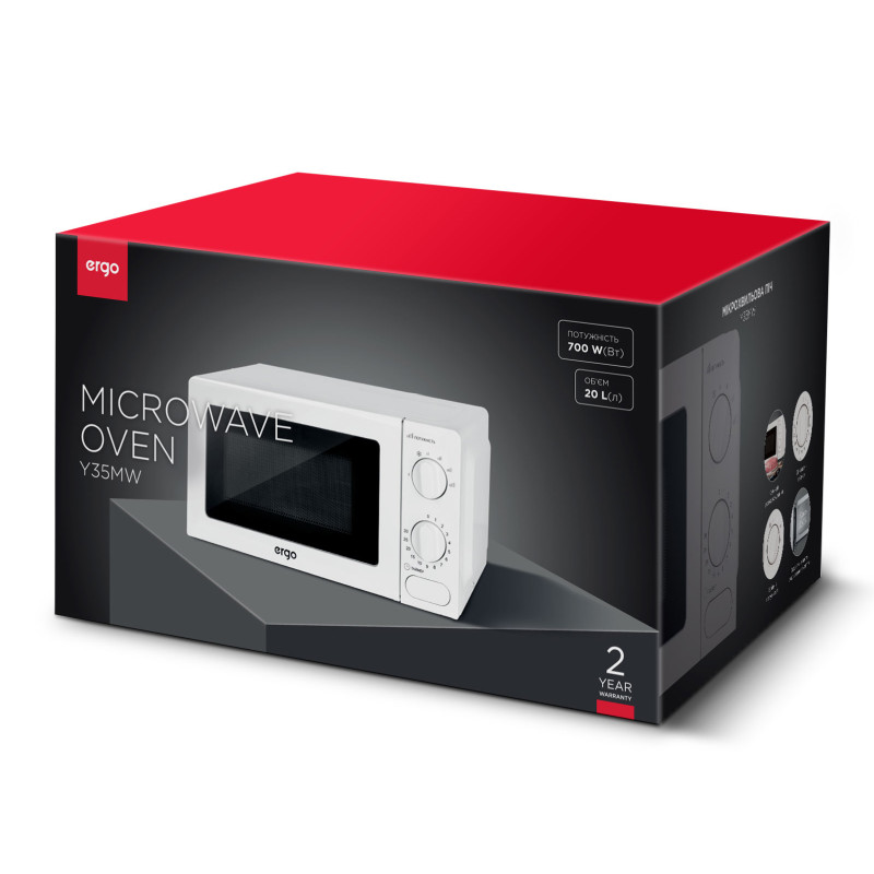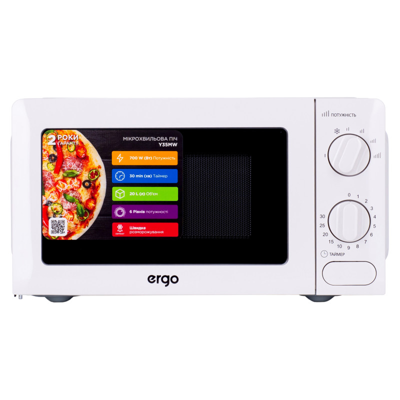 Мікрохвильова піч ERGO Y35MW - техніка, яка чудово підійде для домашньої або офісної кухні. Модель має просте та зручне механічне керування, а також увесь необхідний функціонал для того, аби швидко розігріти чи приготувати їжу.