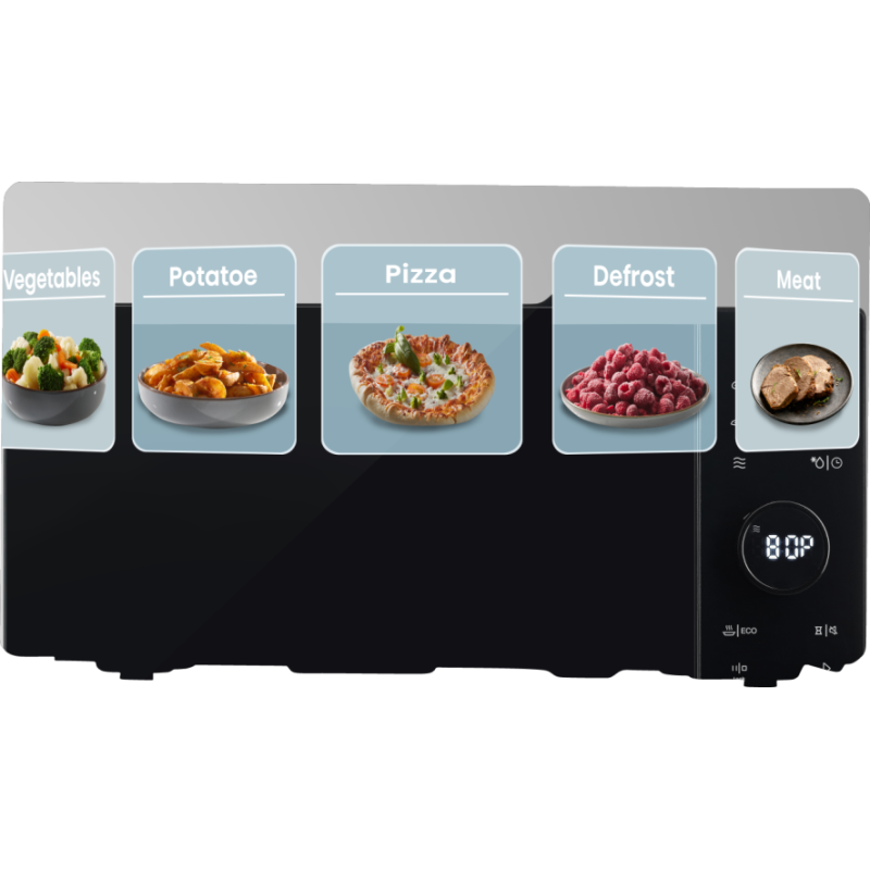 Вісім попередньо встановлених програм завжди допоможуть вам готувати найпоширеніші страви. Виберіть тип страви та введіть вагу інгредієнтів, і піч автоматично відрегулює потужність і тривалість готування. Ви можете налаштувати процес приготування інших страв за допомогою десяти рівнів потужності.