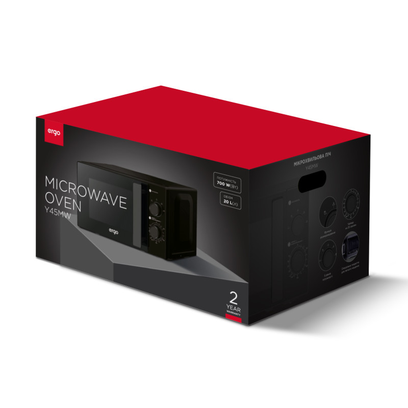 Модель ERGO Y45MW – це стильна мікрохвильова піч з повним набором необхідних функцій, без якої не обійтися на сучасній кухні. Ця піч виконана в трендовому чорному корпусі з металу, скла і пластику. Мікрохвильова піч оснащується зручною й дуже стильною накладною ручкою, що робить її по-справжньому привабливим пристроєм та дозволяє чудово вписатися в будь-який інтер’єр.