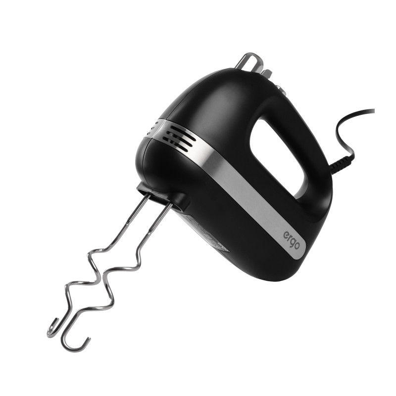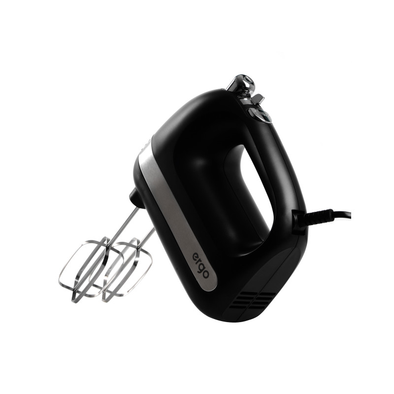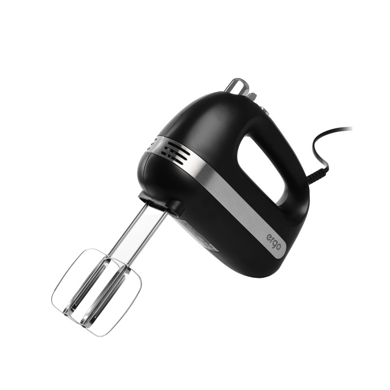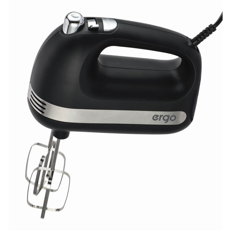 Ручний міксер ERGO CD 8800 допоможе зручно та швидко готувати страви з рідкого й густого тіста, збивати вершки та яйця, робити креми, соуси і муси тощо. Міксер має класичну заокруглену форму корпусу та стильний вигляд завдяки матовому чорному пластику й сріблястій металевій окантовці.