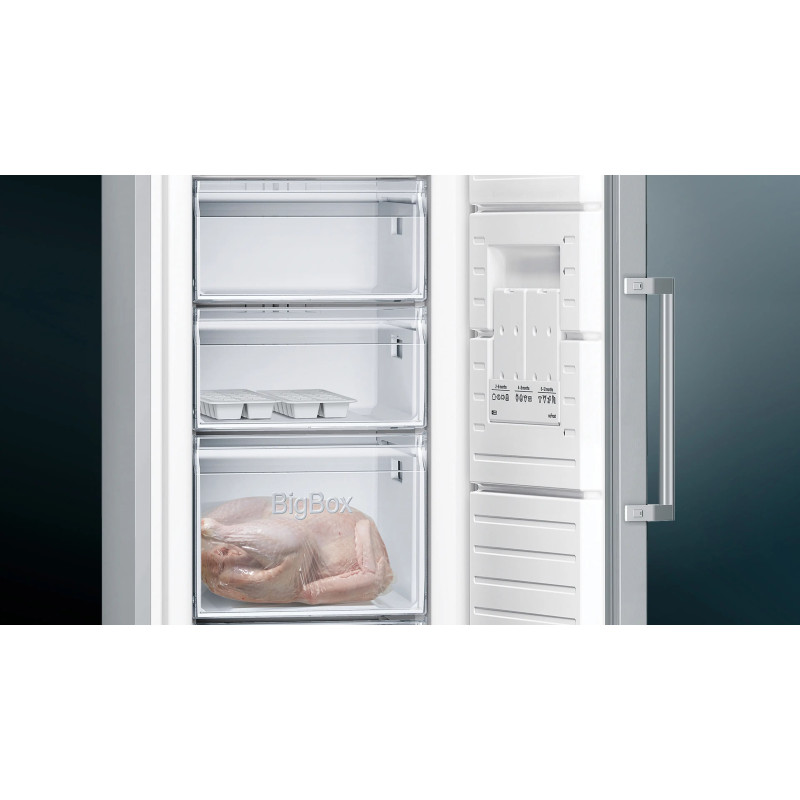 Морозильна камера Siemens GS36NFIEV серії iQ300 — окремовстановлювана модель із корисним об’ємом 242 л. Технологія noFrost усуває потребу у ручному розморожуванні та підтримує стабільні умови зберігання. Система multiAirflow забезпечує рівномірний розподіл холодного повітря всередині камери. Покриття antiFingerprint зменшує помітність слідів на поверхні з нержавіючої сталі.