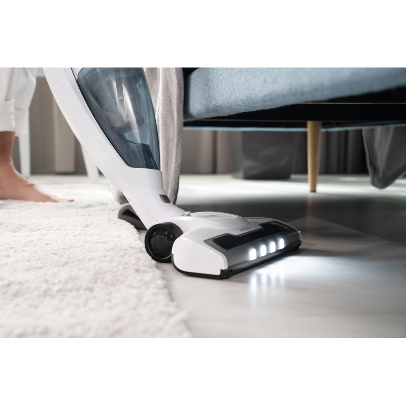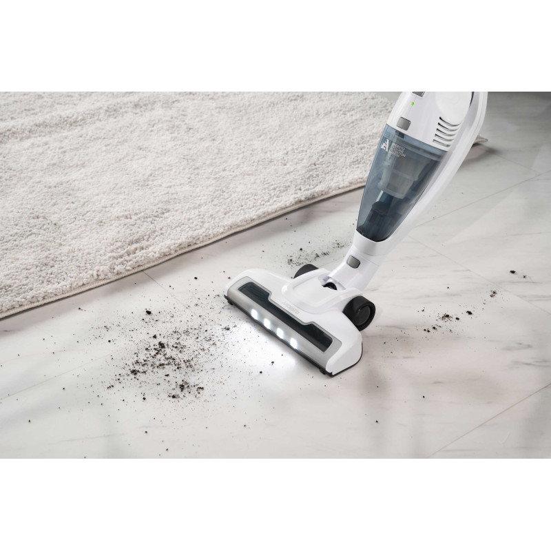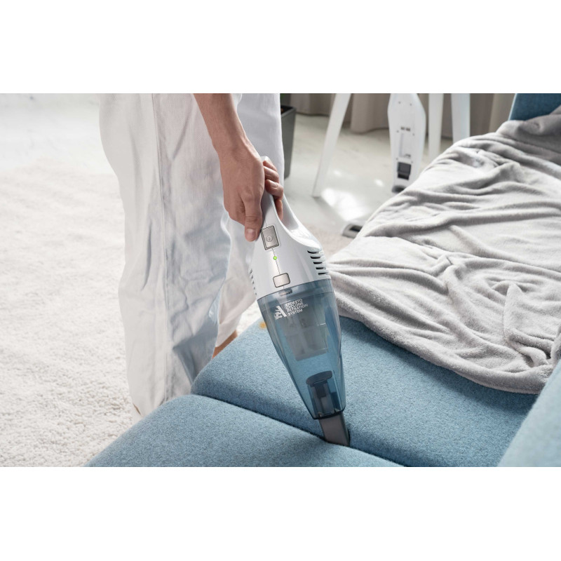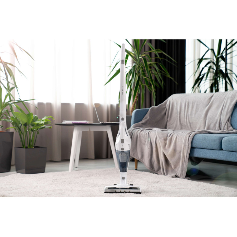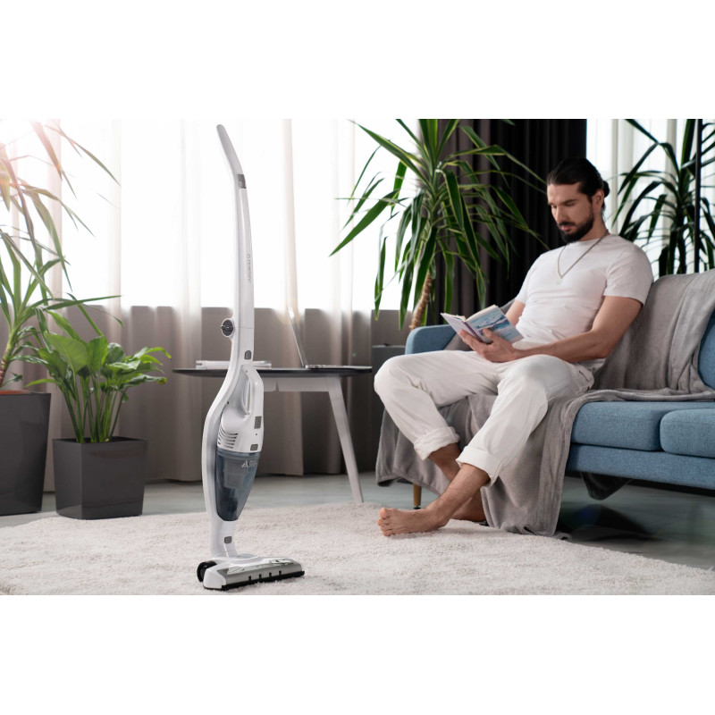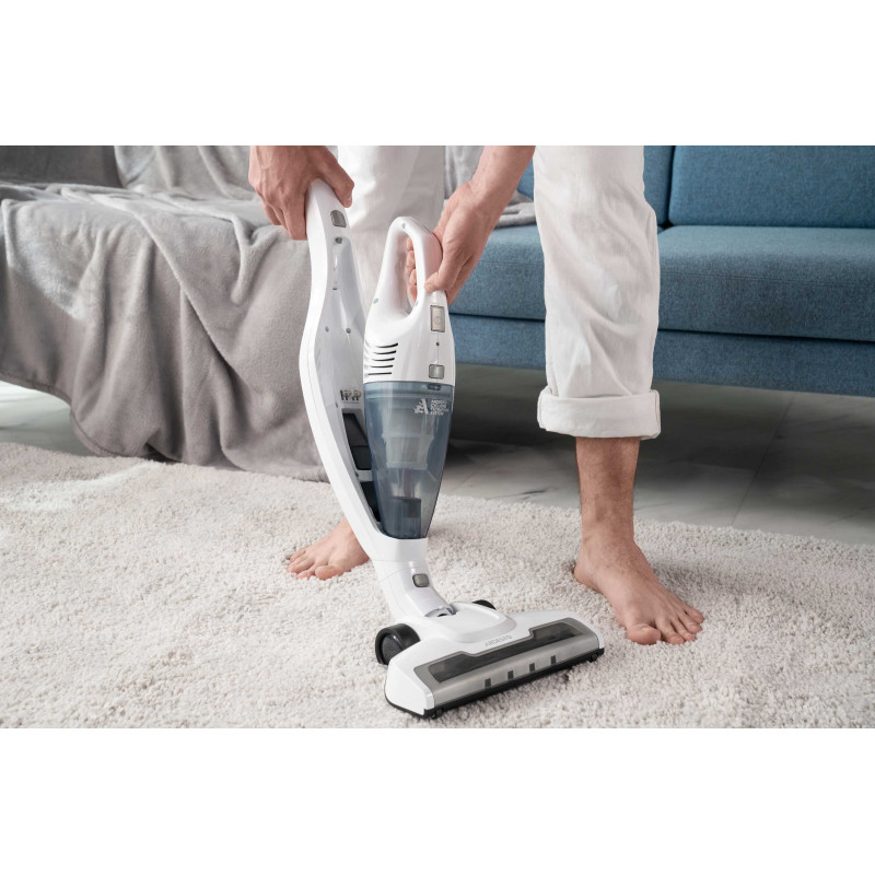Бездротовий акумуляторний пилосос із потужністю всмоктування 29 Вт допоможе ефективно прибрати приміщення, адже оснащений HEPA-фільтром, що затримує дрібнодисперсні часточки та пил. Неспростовною перевагою, зокрема для людей, які страждають від алергії на домашній пил, є те, що під час збирання сміття, пилосос ще й очищує повітря. У комплекті постачання є кріплення для вертикального встановлення на стіну та дві насадки: для прибирання важкодоступних місць та турбощітка. Неспростовною перевагою за умов перебоїв в електропостачанні є можливість автономної роботи: у турборежимі – 17 хв., у звичайному – 35 хв. Крім того, конструкцією передбачено знімний ручний модуль для швидкого прибирання.