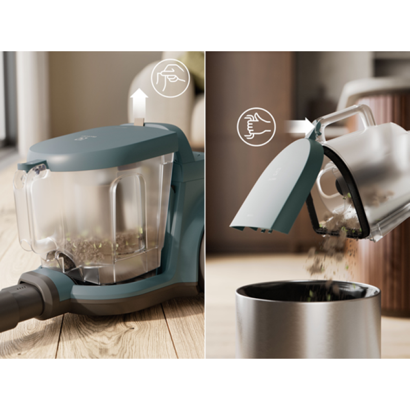 Система циклонного розділення дає змогу прибирати без переривання для очищення приладу від сміття: сміттєзбірник об'ємом 2 л і розміром XXL, який легко спорожнюється, що допомагає подовжити прибирання.Легке очищення без безладу