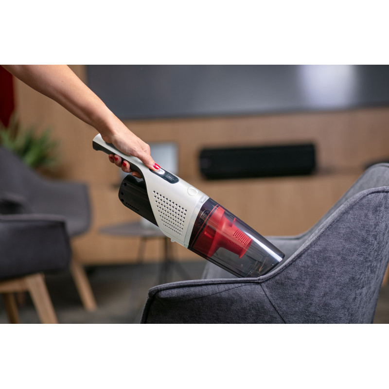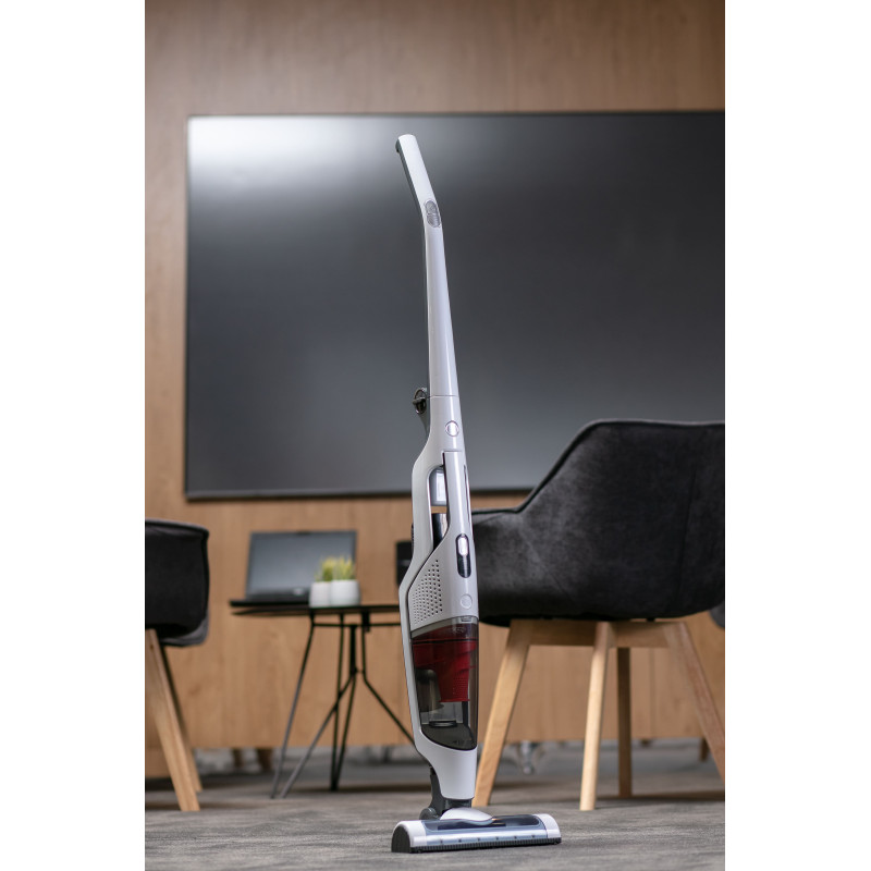 Це автономний пилосос. Не потрібно його паркувати на зарядній станції. Зручна складна ручка дозволяє прибрати пилосос на зберігання в невелику шафку, а від'єднаний акумулятор можна заряджати будь-де. Завдяки потужній літієвої батареї 20000 мАг ви не відчуєте втрату потужності під час прибирання. Навіть при повному заряді пилосос працює з максимальною потужністю. Одним рухом відкрийте засувку, від'єднайте контейнер і витрусіть пил. Контейнер встановлюється на місце за лічені миті.