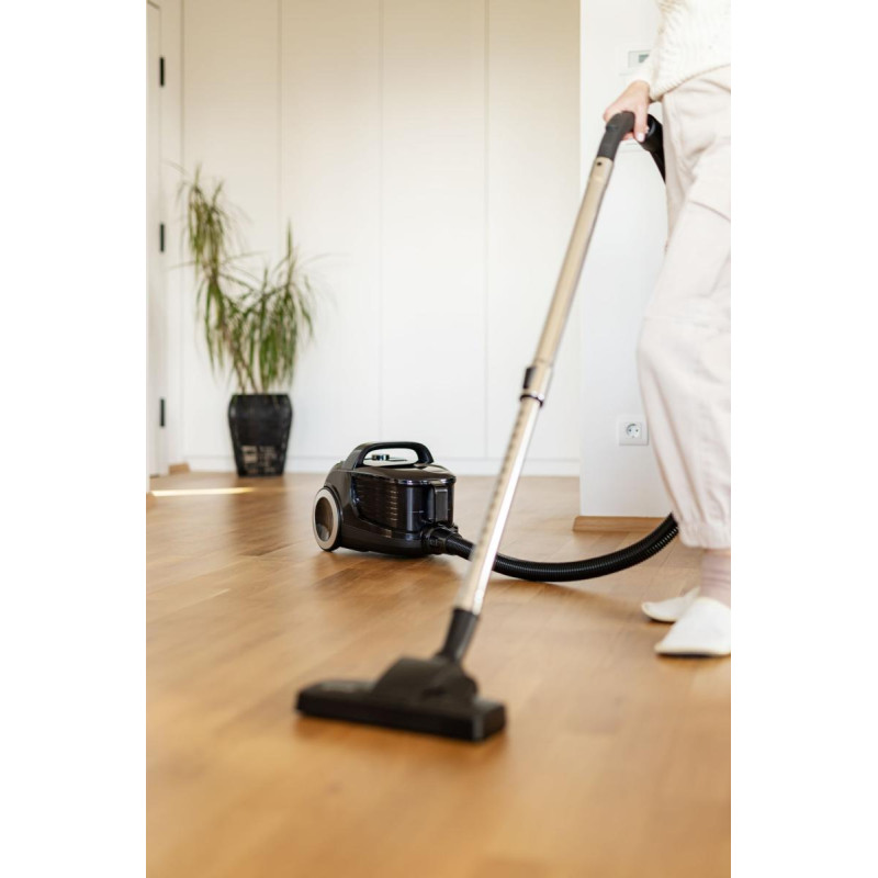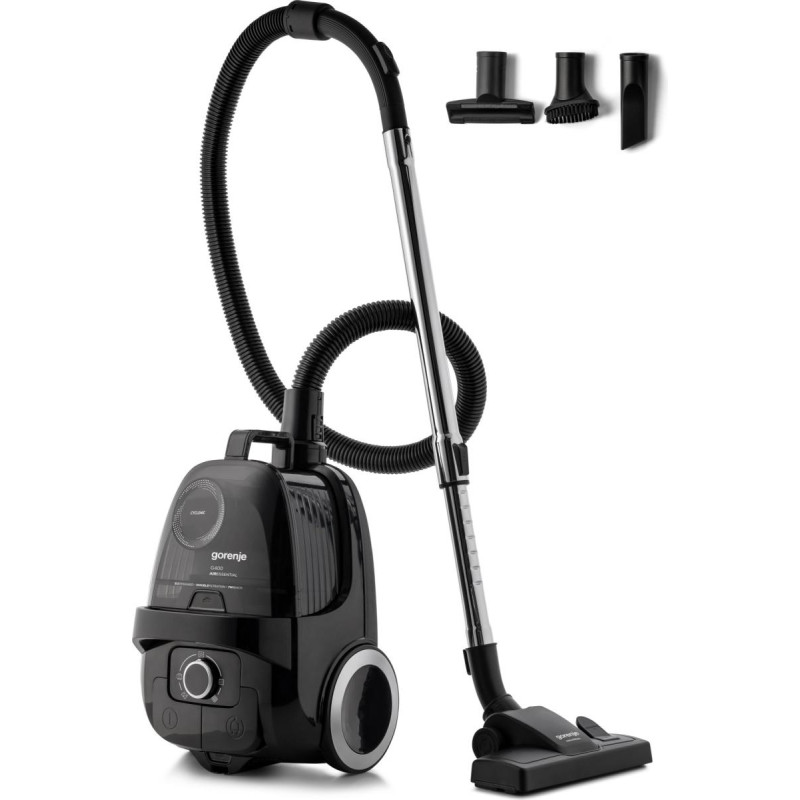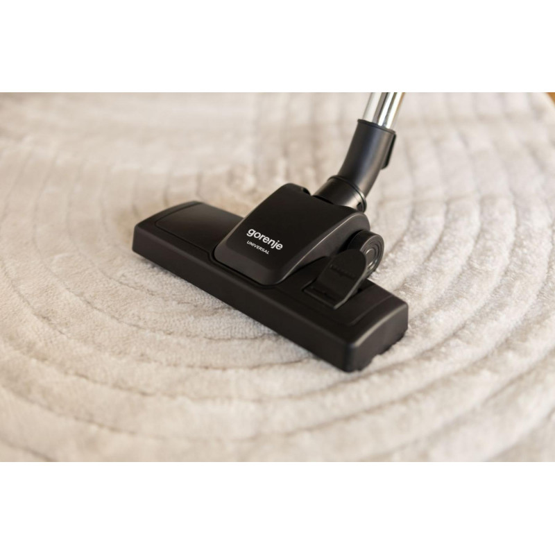 Пилосос Gorenje AIRESSENTIAL оснащений пластиковим контейнером для пилу об’ємом 3,3 л, потужністю 800 Вт і всмоктувальною силою 180 Вт. Має HEPA-фільтр, телескопічну металеву трубку, гнучкий шланг і захист від перегріву. Радіус дії – 7 м, рівень шуму – 76 дБ(А).