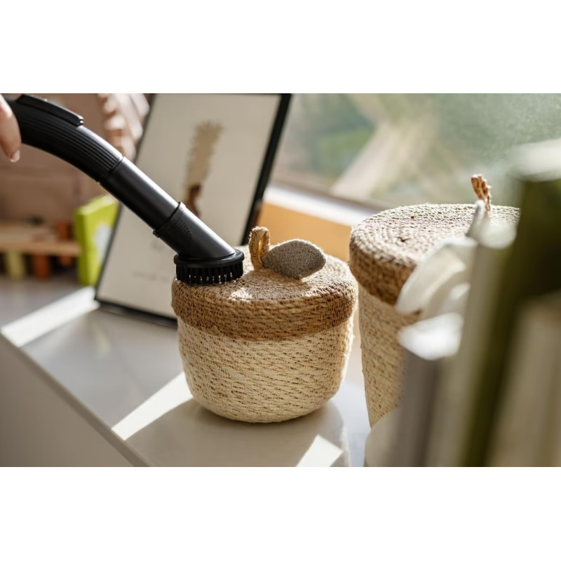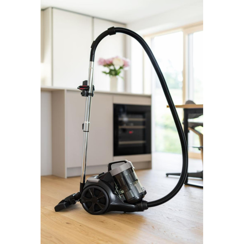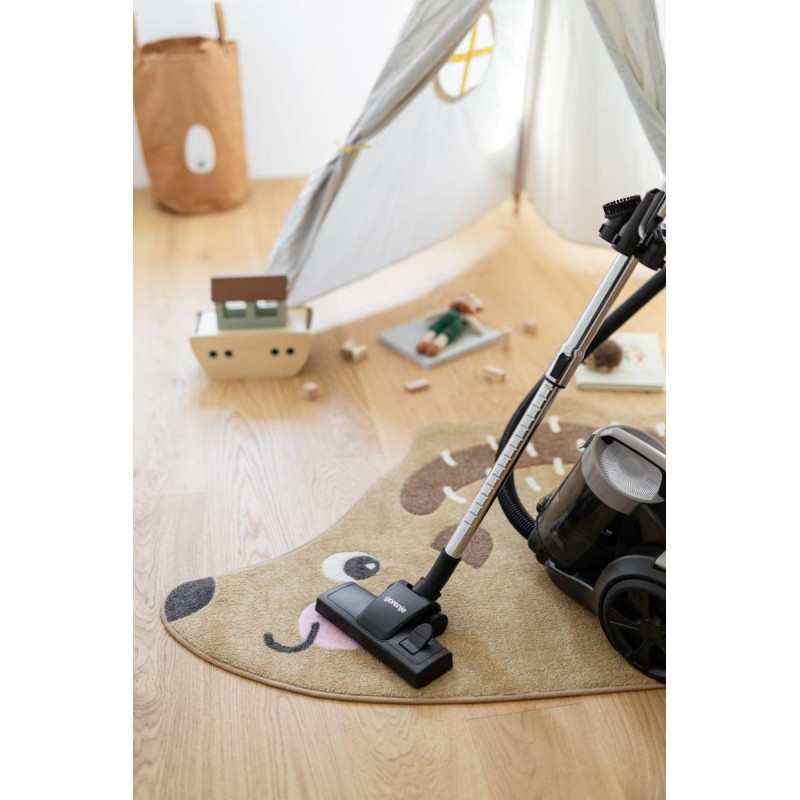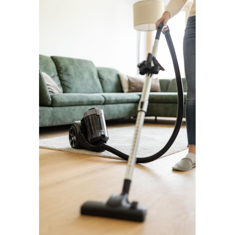 Контейнерний пилосос Gorenje TWIST II з приєднувальною потужністю 850 Вт створений для сухого прибирання та збирання пилу у пластикову ємність об’ємом 3,3 літра. Потужність всмоктування 140 Вт та повітряний потік 21 л/с підтримують стабільну роботу під час очищення підлог і килимів. HEPA-фільтр утримує дрібні частинки, забезпечуючи чистіший вихідний потік. Телескопічна трубка та поворотна ручка підвищують зручність користування. Гумові колеса та продумана конструкція допомагають пересувати прилад без пошкоджень поверхонь.