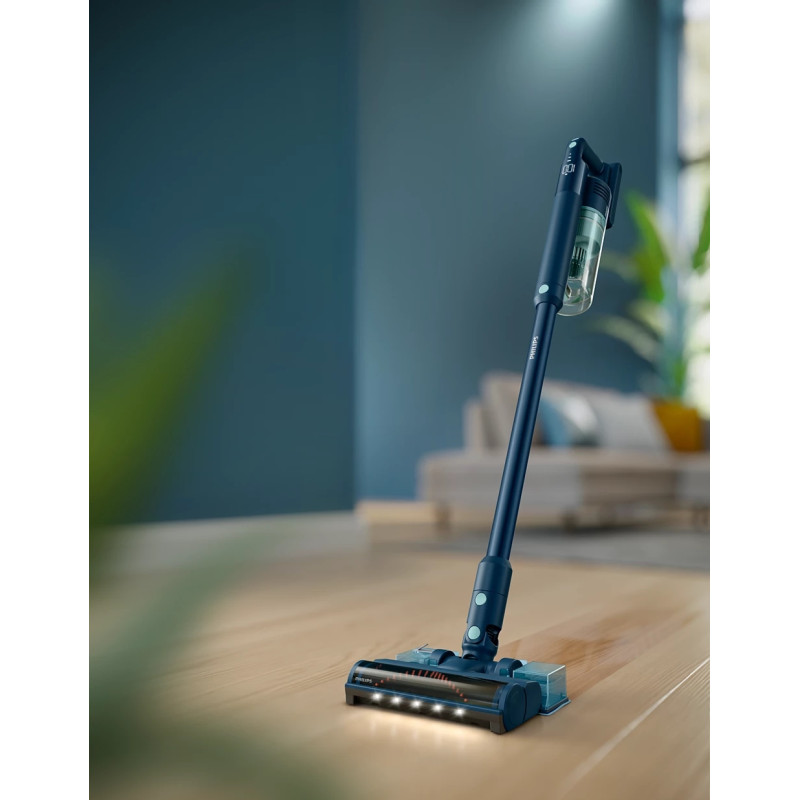 Безпровідний пилосос Philips Series 5000 XC5141/01 оснащений технологією PowerCyclone 10 для ефективного видалення пилу з низьким споживанням енергії. Він забезпечує до 60 хвилин роботи в екорежимі та має знімний аквамодуль для того, щоб одночасно пилососити та митти підлогу. Світлодіодна насадка виявляє прихований пил, а інтуїтивний екран відображає стан батареї та вибраний режим роботи. Пристрій включає комбіновану щітку, щілинну насадку та мінінасадку з турбощіткою для очищення важкодоступних місць.