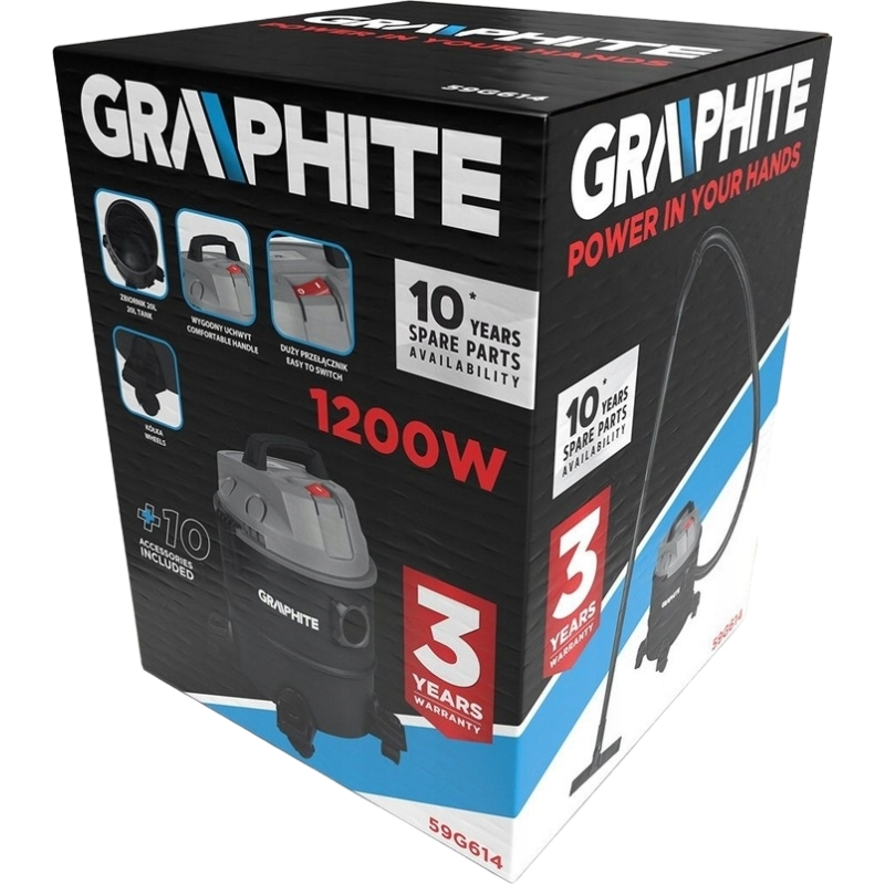 Професійний пилосос потужністю 1200 Вт забезпечує надзвичайну силу всмоктування в 18 кПа, дозволяючи швидко впоратися з найскладнішими завданнями очищення. Зручний 20-літровий контейнер дає змогу працювати довше без необхідності частого очищення бака, а 2-метровий шланг забезпечує зручний доступ навіть до віддалених місць. Завдяки міцним колесам пристрій легко транспортувати, що додає зручності при роботі на великих площах.