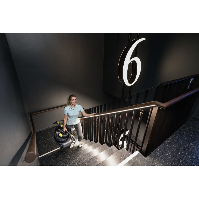 Професійний миючий пилосос Karcher Puzzi 8/1 Adv ефективно очищає килими, меблеву оббивку та інші текстильні поверхні завдяки глибокому розпиленню миючого розчину і швидкому збору вологи. Прозора кришка, насадки та оглядове вікно в рукоятці забезпечують контроль процесу. Легка вага, ергономічна ручка та великі кнопки роблять апарат зручним у використанні. Компактна й міцна конструкція гарантує тривалий термін служби, що особливо цінно для клінінгових компаній, готелів, ресторанів та сервісів з хімчистки автомобілів.
