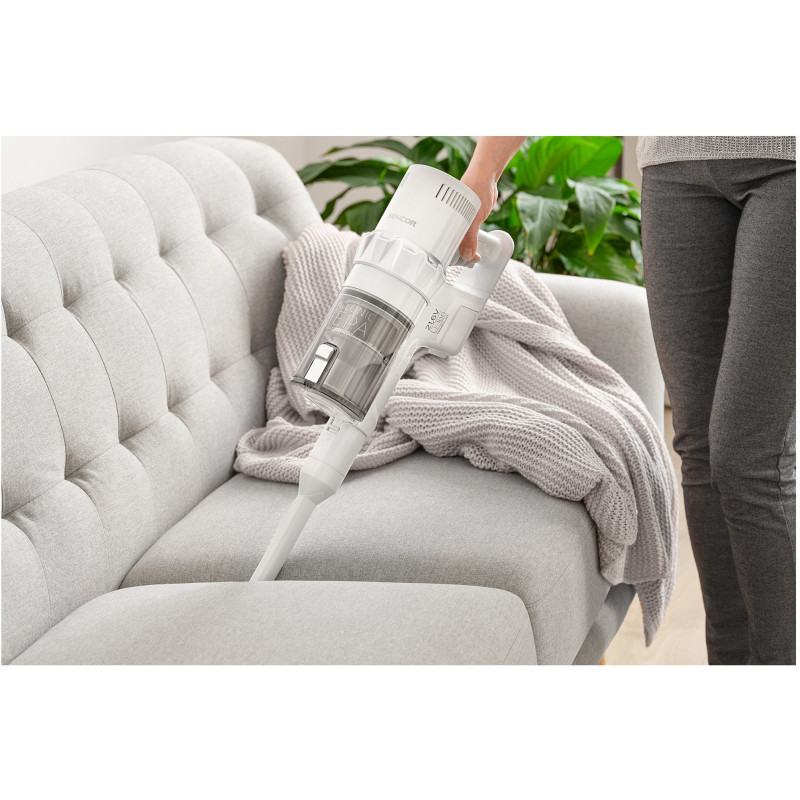 Акумуляторний вертикальний пилосос 2 в 1 - це чудовий помічник для простого та досконалого прибирання. Він обладнаний цифровим двигуном з потужністю 250 Вт, який гарантує відмінні результати прибирання для всіх типів поверхонь. Він легкий, з простим керуванням, і завдяки цьому можна виконувати прибирання у важкодоступних та високих місцях. Насадка зі світлодіодним освітленням допомагає легко виявити навіть незначний пил і спрощує прибирання в темних місцях.