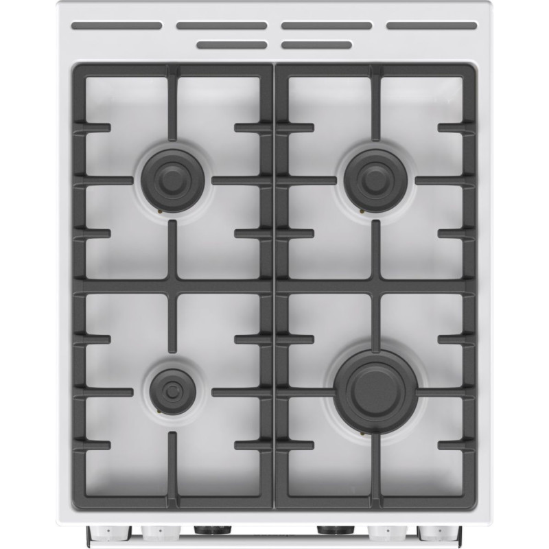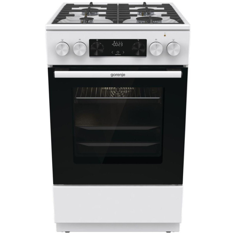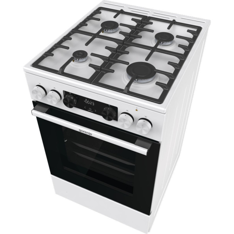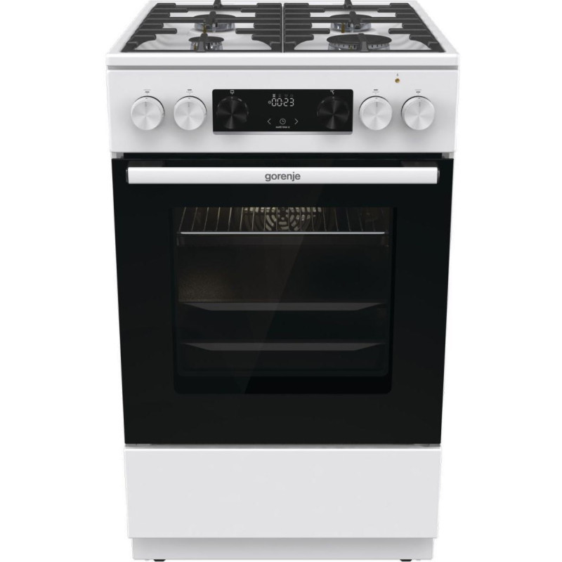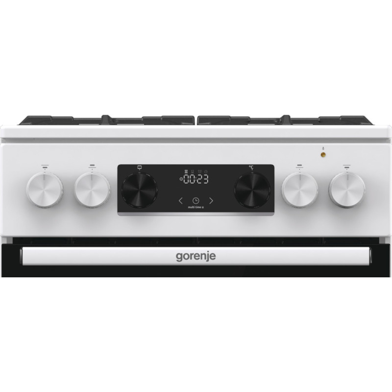 Комбінована плита Gorenje (50×60 см, біла) поєднує у собі газову варильну поверхню з чавунними решітками та багатофункціональну електричну духовку об'ємом 70 л. Оснащена електронним програматором IconLed, системою очищення парою AquaClean, телескопічними напрямними та плавним закриттям дверцят SoftClose.