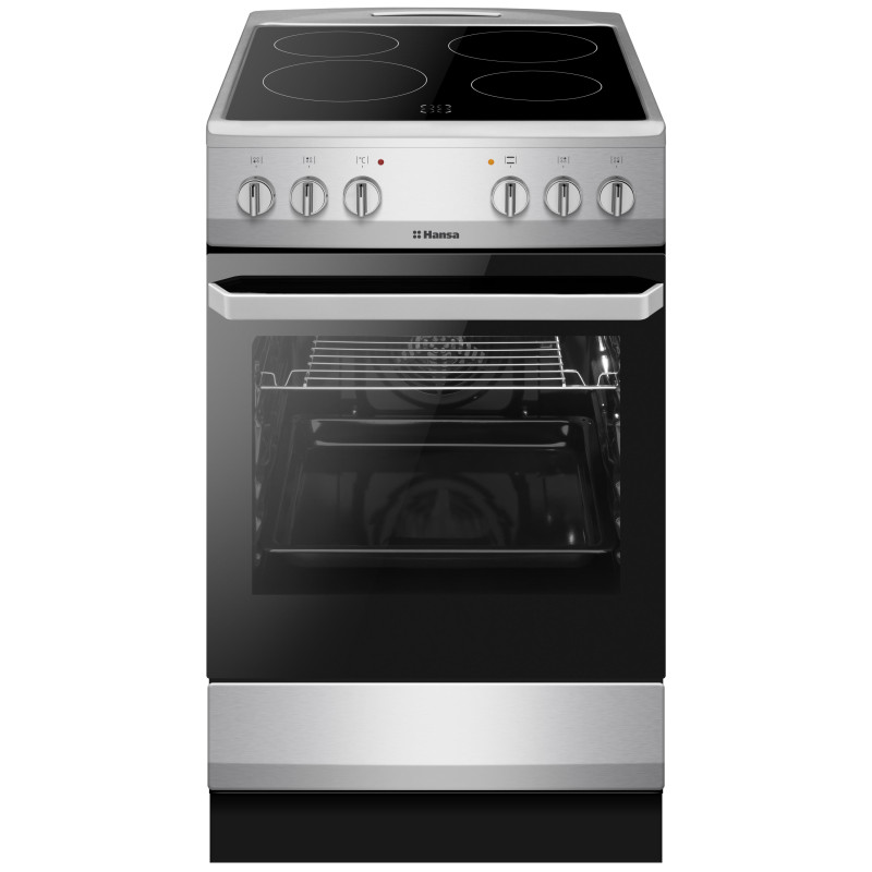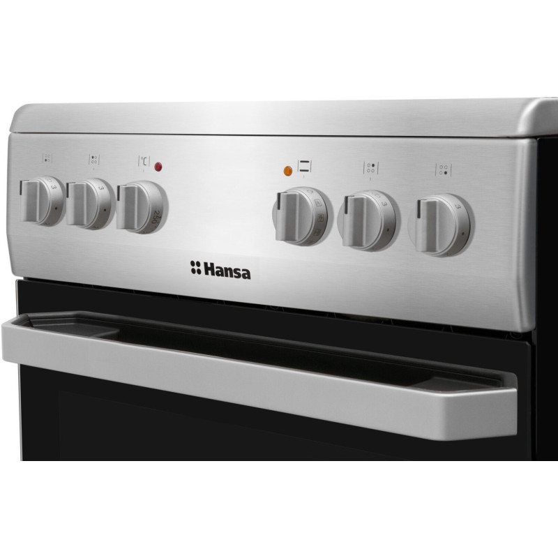 Hansa FCCS56069 – це сучасна електроплита з нержавіючої сталі, оснащена високоефективною склокерамічною варильною поверхнею. Вона має 4 зони нагріву та простору духовку об’ємом 62 літри з конвекцією, що забезпечує рівномірне приготування страв. Подвійне скло дверцят підвищує енергоефективність, а гладка поверхня легко очищується.
