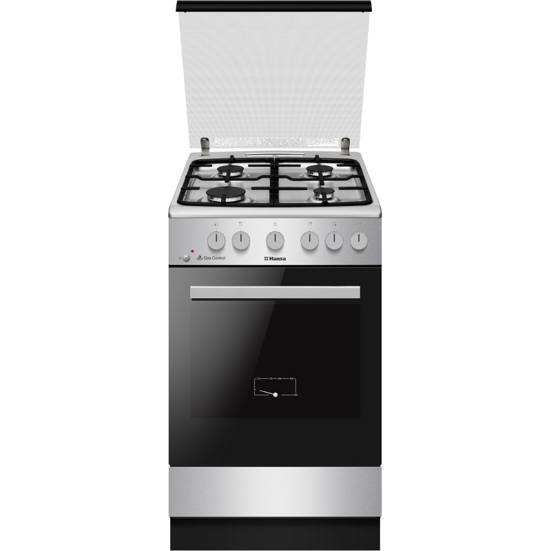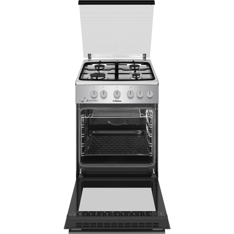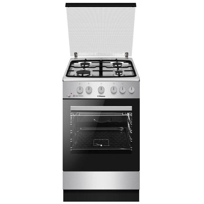 Газова плита Hansa FCGX53193 з нержавіючої сталі з чавунними решітками, 4 конфорками та електрозапалюванням у ручках. Духовка об’ємом 71 л оснащена нижнім газовим нагрівом, грилем, підсвіткою та глибоким деком у комплекті.