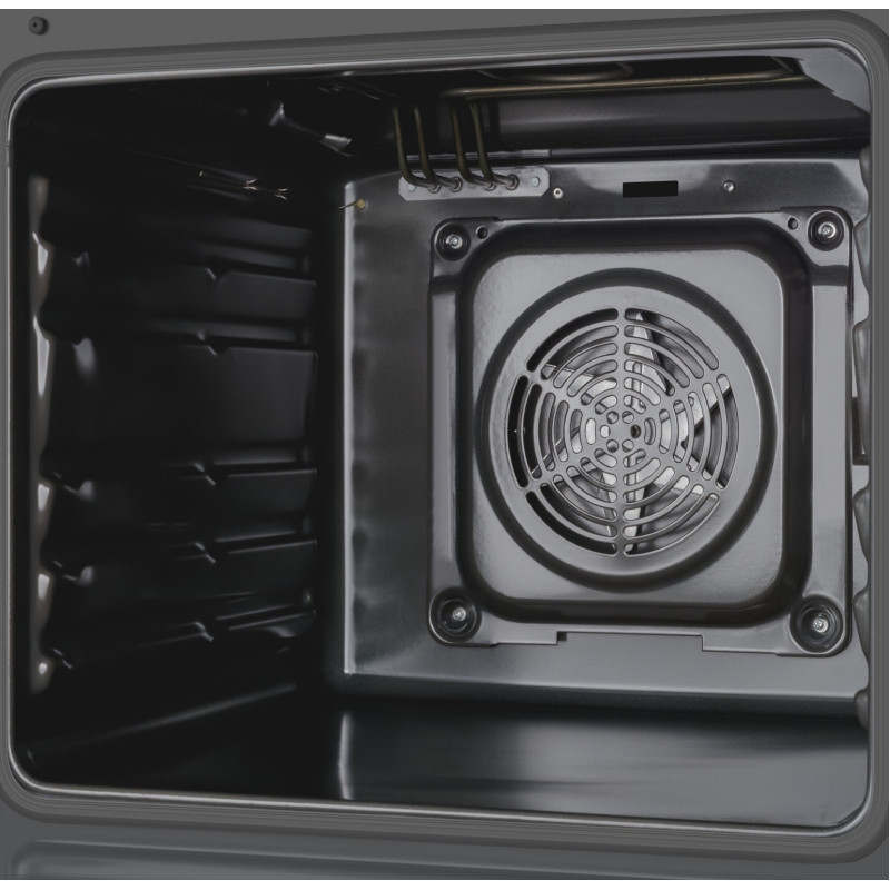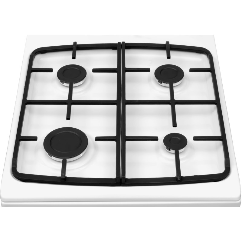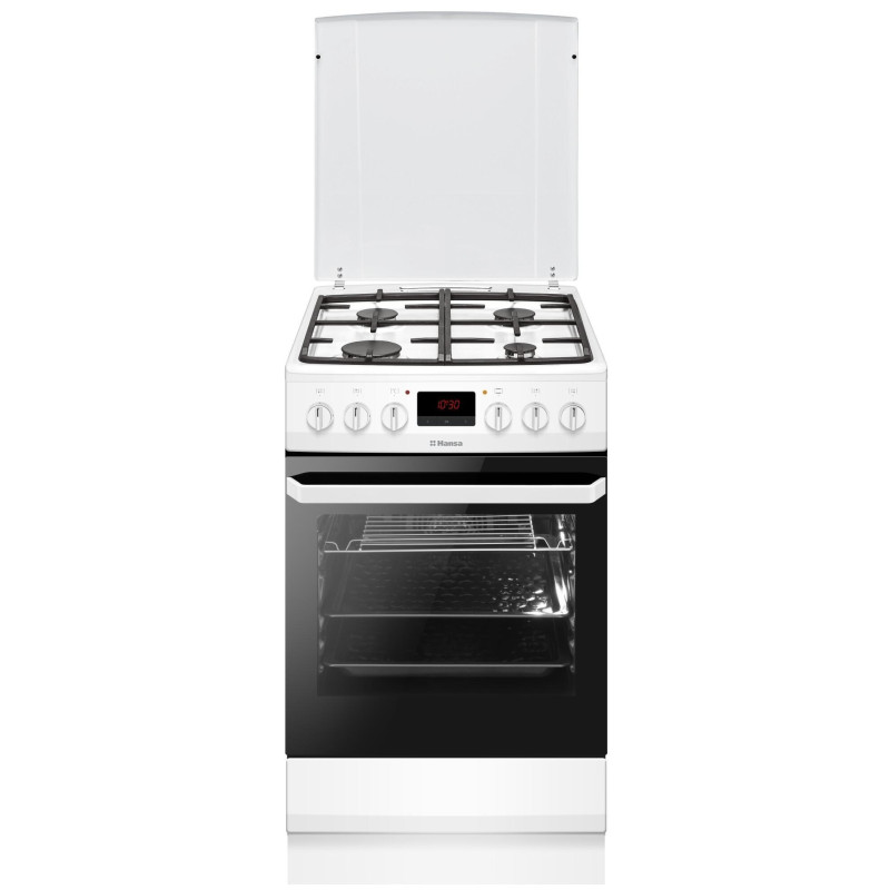 Комбінована плита з газовою варильною поверхнею та електричною духовкою об’ємом 62 л. Оснащена чавунними решітками, системою електрозапалювання в ручках і клапаном безпеки газу. Парове очищення спрощує догляд.