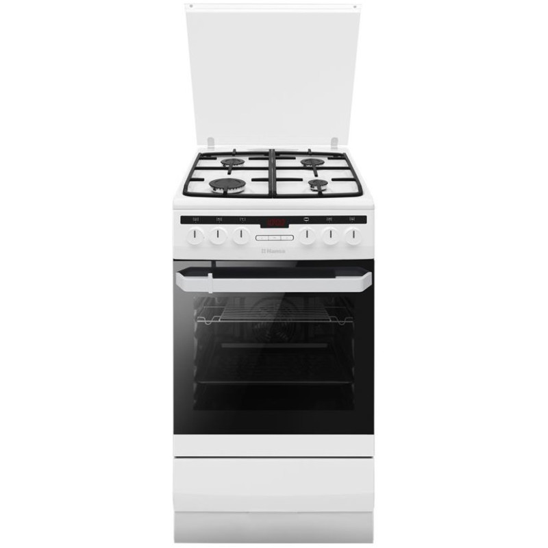 Комбінована плита з газовою варильною поверхнею та електричною духовкою об’ємом 62 л. Має 8 програм приготування, включаючи гриль, конвекцію та швидкий розігрів. Варильна поверхня обладнана чавунними решітками і електрозапалюванням у ручках.