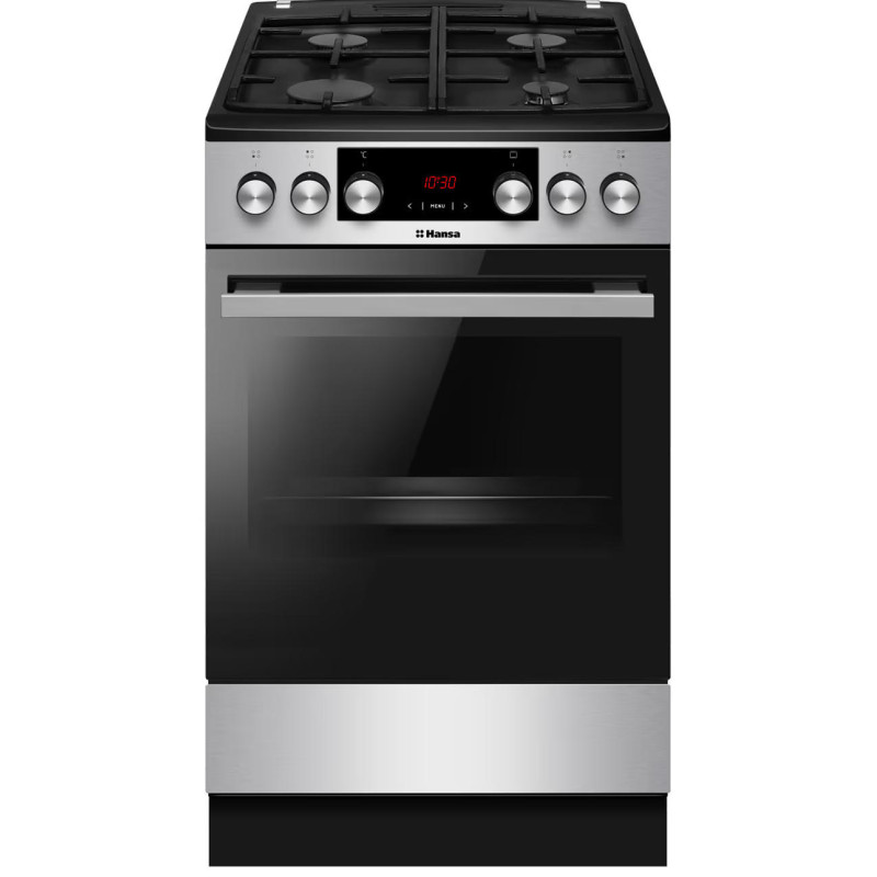 Комбінована плита Hansa FCMX59323 (50×60 см) з газовою варильною поверхнею на 4 конфорки та електричною духовкою об’ємом 65 л. Оснащена 10 режимами приготування, грилем, конвекцією, паровим очищенням та LED-дисплеєм. Чавунні решітки, електрозапалювання в ручках і енергоклас А забезпечують комфорт і зручність щоденного користування.