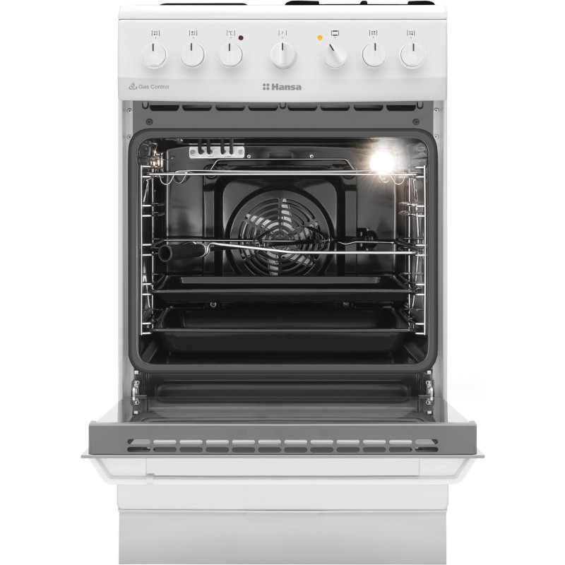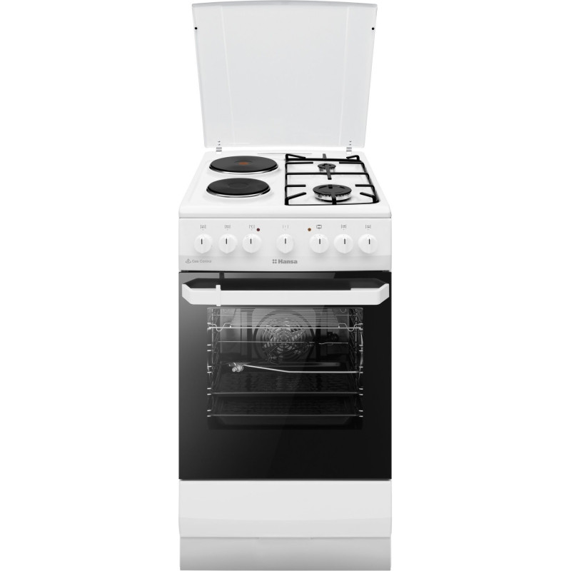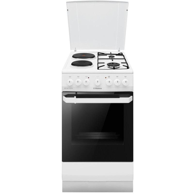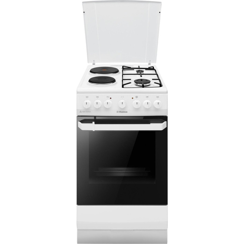 Комбінована плита Hansa FCMW59119 оснащена електричною духовкою на 65 л та змішаною варильною поверхнею з чотирма конфорками – дві газові та дві електричні. Духовка пропонує 10 програм, серед яких гриль, режим піци, швидкий розігрів і розморожування. Система очищення паром полегшує догляд, а два шари скла у дверцятах утримують тепло та роблять використання безпечним.