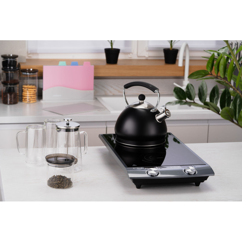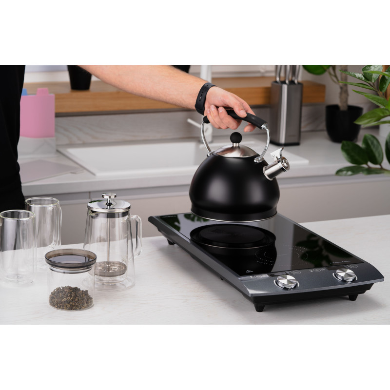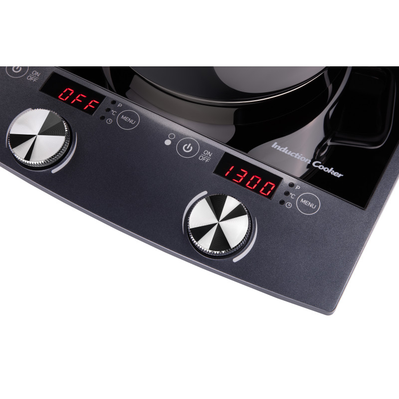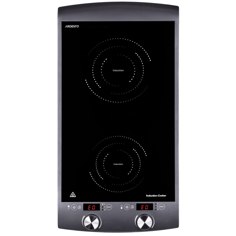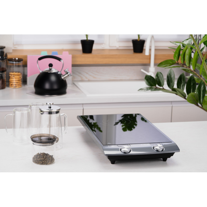 Індукційна електрична варильна поверхня на дві конфорки з загальною потужністю 2900 Вт, комбінованим управлінням, регулюванням температури та потужності, а також таймером приготування та захистом від перегріву і перепадів напруги.