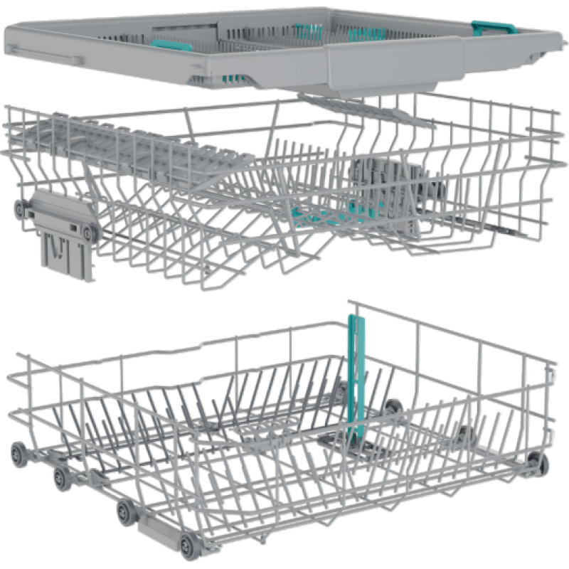 Плавне ковзання верхнього кошика завдяки зручним напрямним на кулькових підшипниках. Для тихого, легкого та швидкого завантаження й розвантаження.Гнучкий третій кошик. Завжди чисті й сухі столові прибори