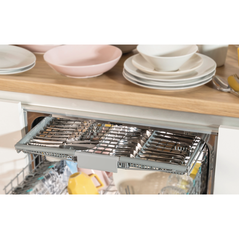 | Особливості | Верхній кошик: 2 тримачі для чашок; Широкий тримач для великих ножів; Фіксовані тримачі для скла; Фіксовані тримачі для тарілок; Складаний тримач для чашок зліва; Широка основа Нижній кошик: Широка основа; Роздільна та складана; Підставка для столових пр |