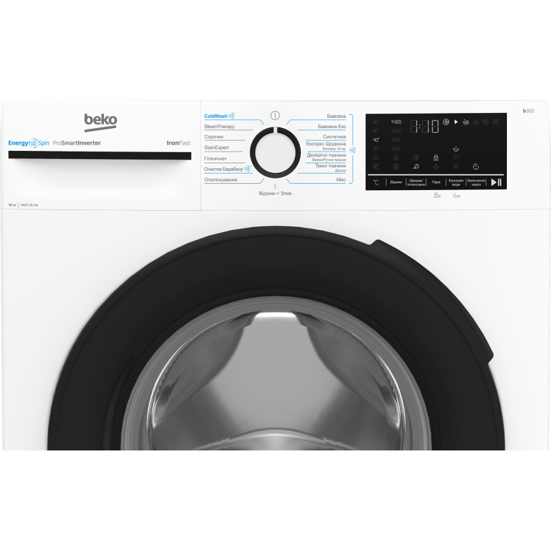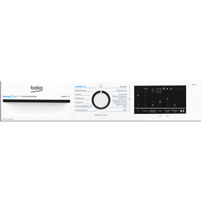 | Програми прання | Стандартна/Бавовна; Cotton Eco; Синтетичні речі; Експрес Щоденна / Експрес 14 хв; Delicates/Wool/HandWash; DarkWash/Jeans; Змішана (Щоденна); Віджим + Злив; Ополіскування; Самоочистка; Гігієнічна+ з парою; StainExpert™; Сороч |