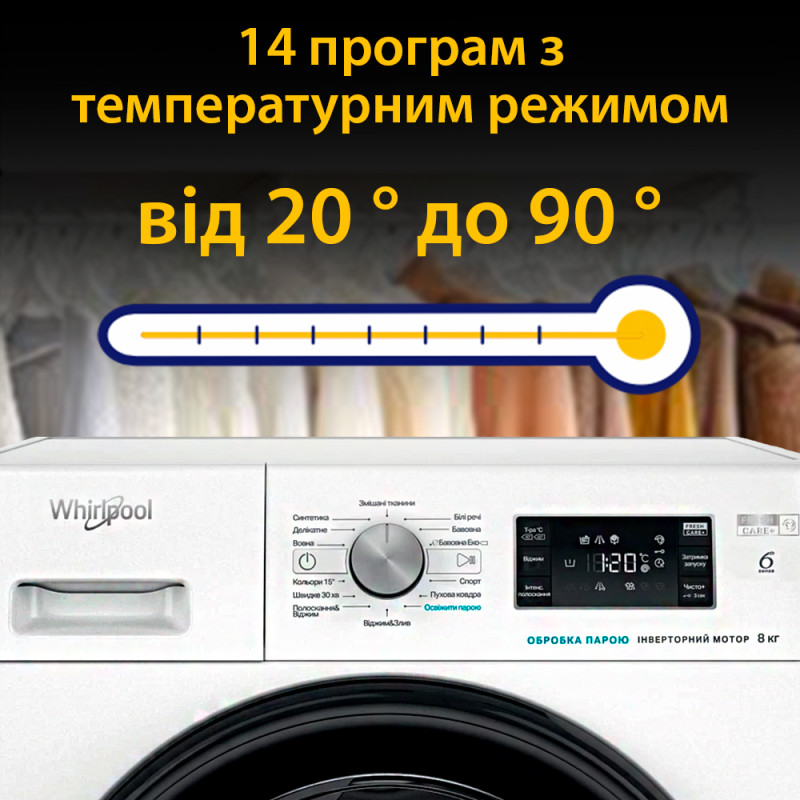 | Програми | Бавовна, Делікатна, Вовна, Швидке прання, Бавовна ЕКО, Спортивний одяг, Полоскання + Віджим, Синтетика, Пухові ковдри, Злив + Віджим, Змішана білизна, Полоскання |