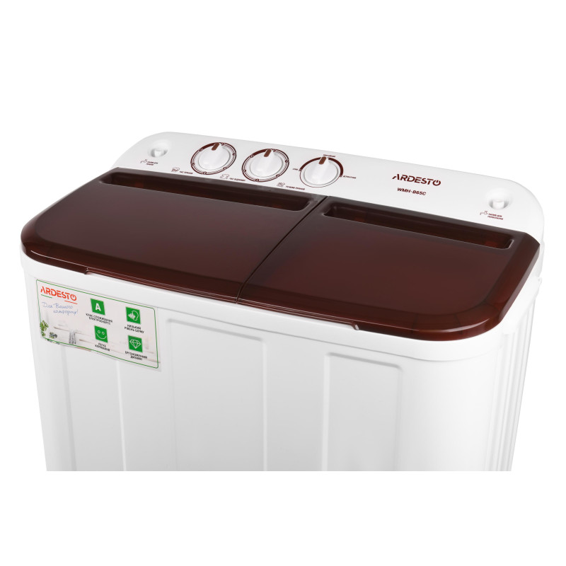 Напівавтоматична пральна машина з вертикальним завантаженням білизни та центрифугою для віджиму. Об’єм баку – 6,5 кг. Таймер прання розрахований на 15 хвилин та на 5 хвилин для віджиму. Клас енергозбереження – A. Є два режими прання – делікатне та звичайне, а також передбачена функція реверсу. Вага WMH-B65C складає 18.5 кг.