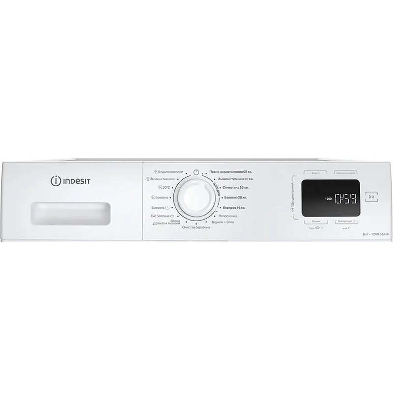 | Програми прання | Бавовна; Еко Бавовна; Змішані тканини; Вовна; 20°C; Бавовна з попереднім пранням; Бавовна 59 хвилин; Синтетика 59 хвилин; Змішане кольорове 59 хвилин; Бавовна 28 хвилин (швидка); Експрес 14 хвилин; Очищення барабана; |