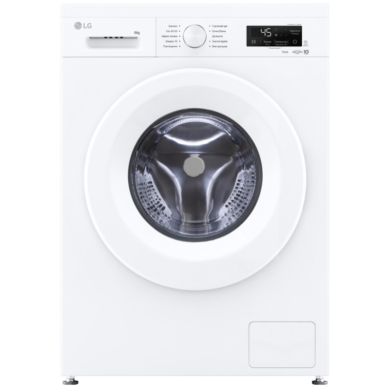| Програми | Бавовна, Делікатна, Спортивний одяг, Моя програма, Еко 40-60, Додаткові програми прання, що завантажуються через додаток LG ThinQ, Швидке прання 30', Змішані тканини, Вовна / ручне прання, Повсякденне прання |