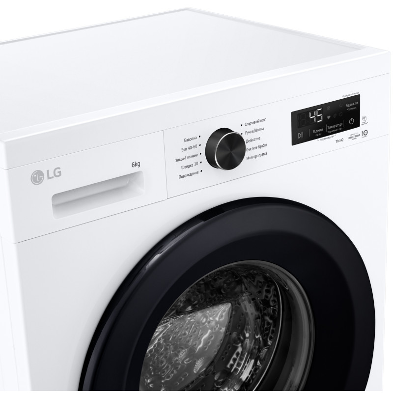 | Програми | Бавовна, Делікатна, Спортивний одяг, Моя програма, Еко 40-60, Додаткові програми прання, що завантажуються через додаток LG ThinQ, Швидке прання 30', Змішані тканини, Вовна / ручне прання, Повсякденне прання |
