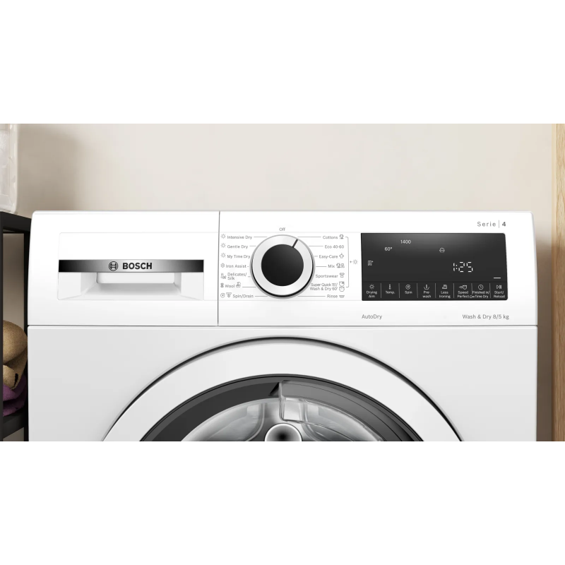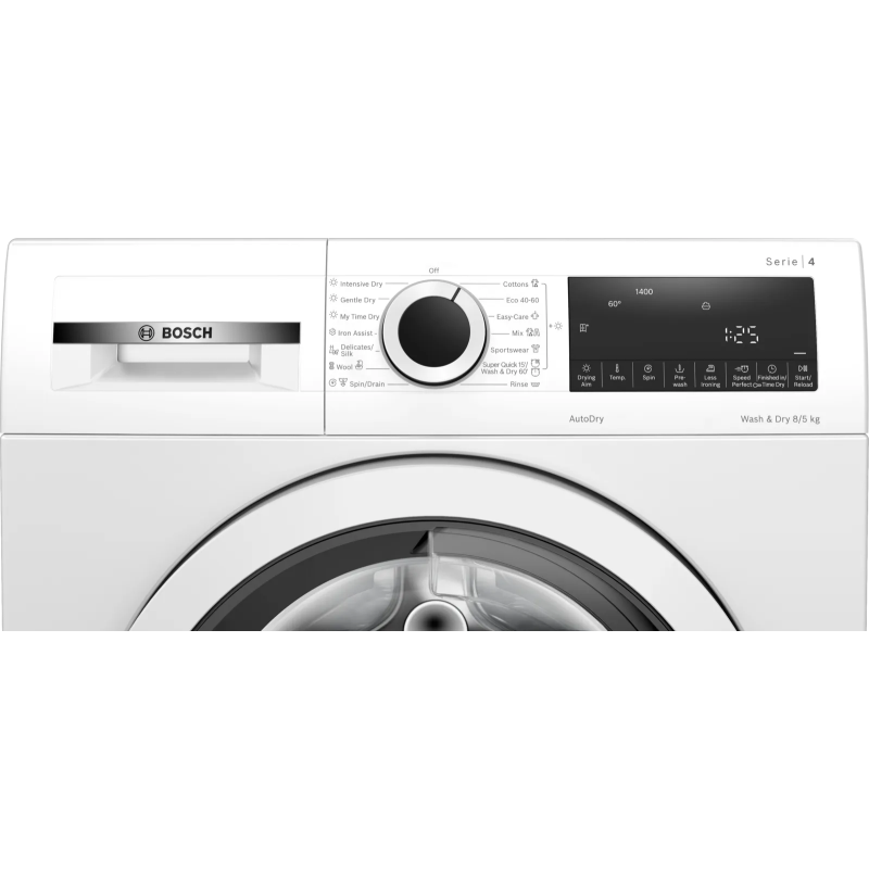 Прально-сушильна машина Bosch WNA13400BY поєднує прання та сушіння в одному корпусі. AutoDry контролює вологість і завершує сушіння в потрібний момент. Безщітковий двигун EcoSilence Drive працює тихо та стабільно. Wash&Dry 60 дозволяє виконати повний цикл для невеликого завантаження за одну годину, а Iron Assist обробляє білизну парою, зменшуючи складки.