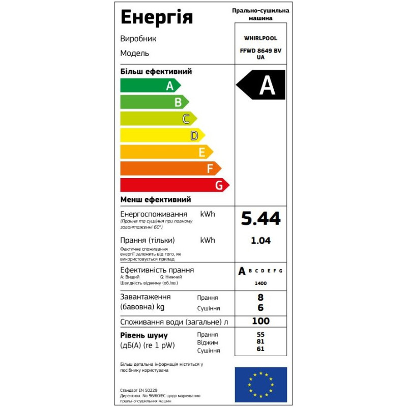 | Програми | Бавовна, Делікатна, Вовна, Бавовна ЕКО, Полоскання + Віджим, Швидка 30 хв., Спорт, Білі речі, Віджим/злив, Кольори 15°, синтетика, Змішані тканини, Прання/Сушіння 90°, Прання/Сушіння 45° |