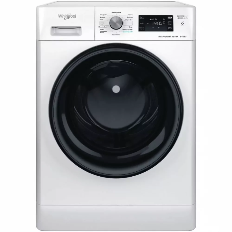 Прально-сушильна машина Whirlpool FFWD8649BVUA з технологією 6TH SENSE автоматично оптимізує прання. FreshCare+ зберігає свіжість одягу, а інверторний двигун забезпечує тиху та економну роботу. Colours 15° пере кольорові речі при 15°C, а спеціальні режими піклуються про вовну, делікатні тканини та спортивний одяг. Програма 45 хв швидко пере та сушить 1 кг білизни, а SteamCare освіжає речі парою. Відкладений старт дозволяє налаштувати прання на зручний час.