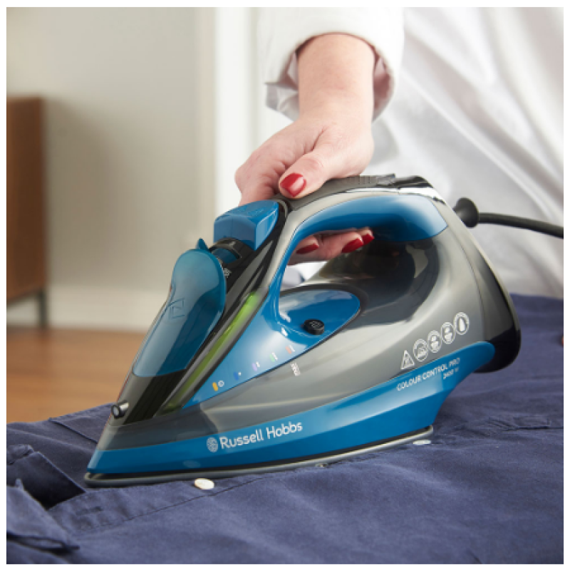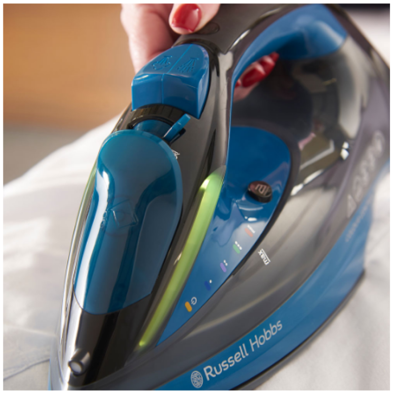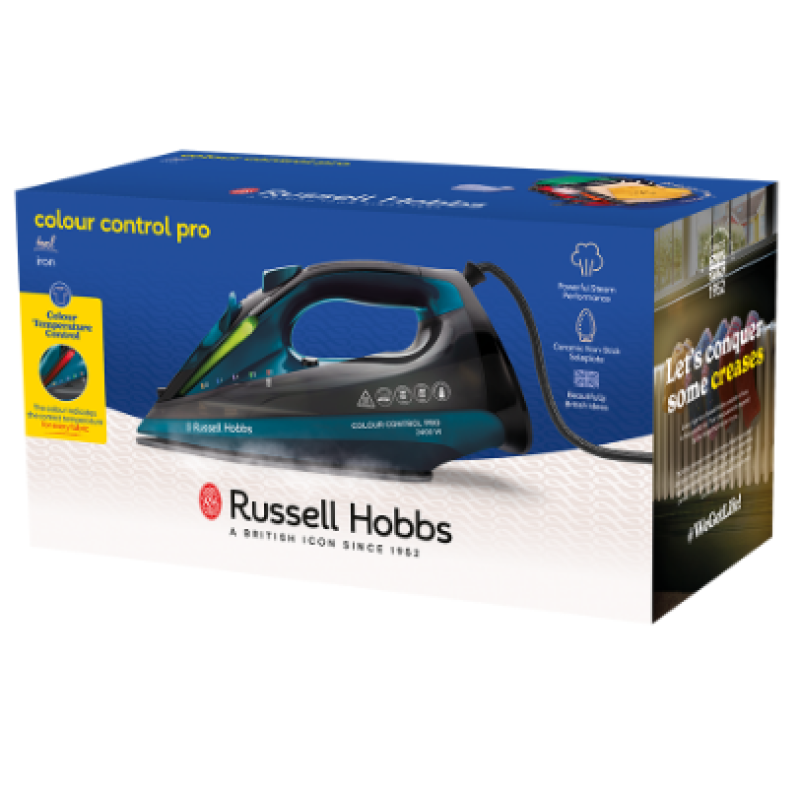 Праска Russell Hobbs Color Control Pro Iron використовує цифрові кольорові дисплеї для вказівки налаштування температури за допомогою зручної кнопки на ручці. Хочете розгладити вовняні вироби або видалити найглибші складки на денімі? Ваша праска засвітиться, коли ви виберете налаштування нагріву, позначені кольором для кожного одягу, що дозволить вам упевнено прасувати!