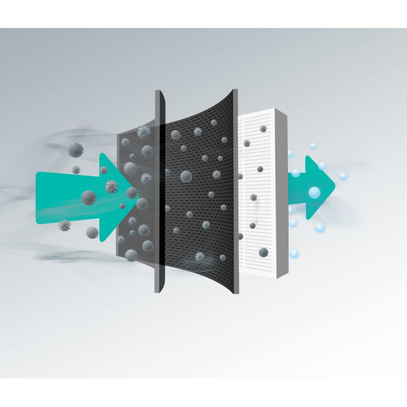HEPA фільтри здатні видалити всі часточки, більші 0,3 мікрон. Це пилок, спори цвілі, пиловий кліщ, бактерії. Вугільний фільтр включає також активоване вугілля, яке, крім часточок пилу, також захоплює хімікати, випари та сигаретний дим. Забудьте про неприємні запахи завдяки поєднанню технологій НЕРА фільтрації та активованого вугілля.