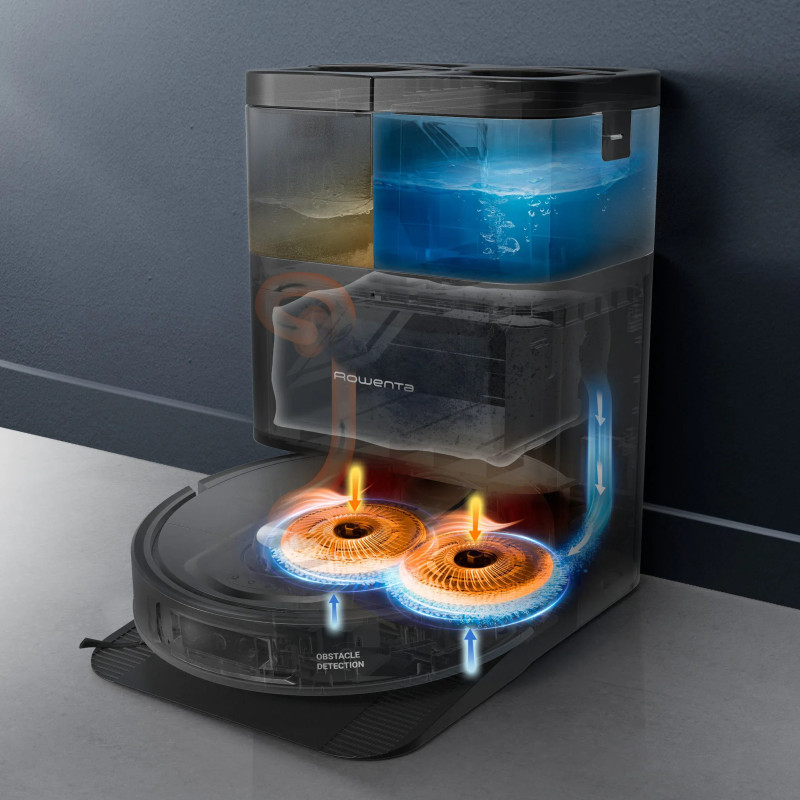 Rowenta X-Plorer Serie 575 Max Standard — робот-пилосос із вологим прибиранням на подвійних обертових мопах і навігацією LiDAR 360°. Потужність всмоктування до 10 000 Па допомагає прибирати пил і сміття на твердих підлогах та килимах. Компактна станція 4-в-1 автоматизує обслуговування після прибирання, зокрема очищення мопів, сушіння гарячим повітрям і спустошення пилозбірника.