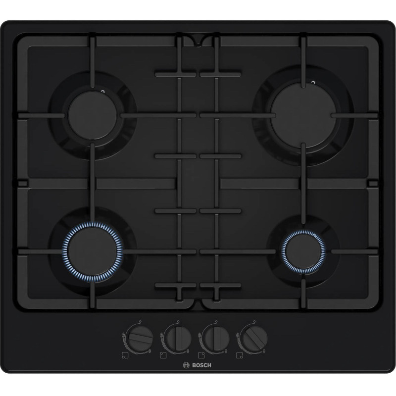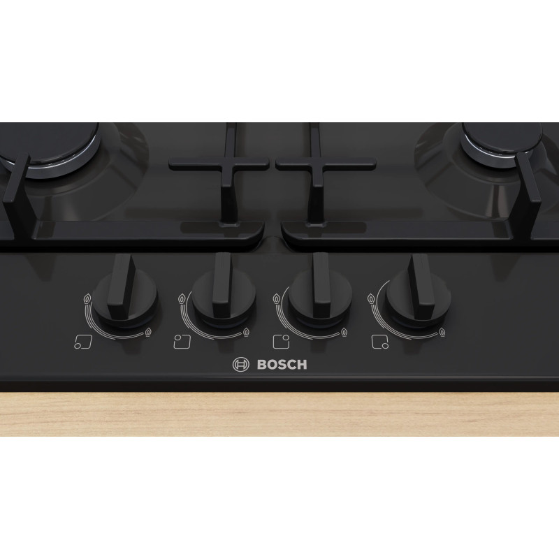 Вбудована газова варильна поверхня Bosch Serie 2 PGP6B6K90R, шириною 60 см, елегантна емальована поверхня в чорному кольорі, 4 конфорки, чавунні решітки, автоматичне електрозапалення та термоелектричний захист від витоків газу.