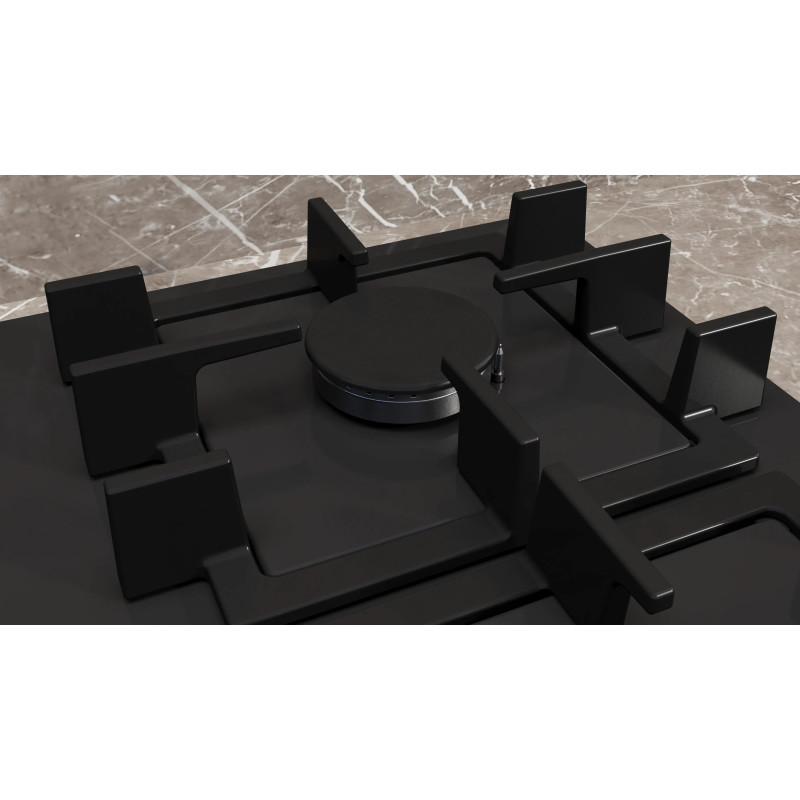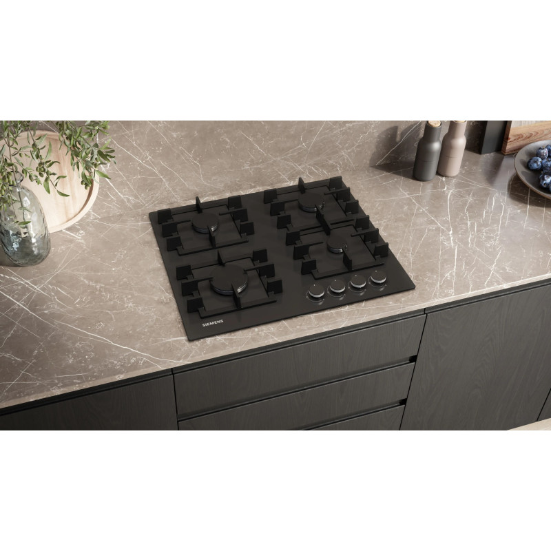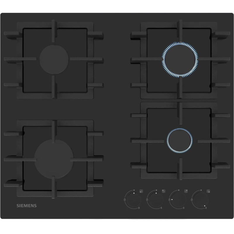 Газова варильна поверхня Siemens EN6B6NP40R з чорним загартованим склом та чавунними решітками. Оснащена 4 газовими конфорками, включаючи потужну 3 кВт, стандартні 1.75 кВт та економічну 1 кВт. Автоматичне електрозапалювання забезпечує зручність, а термоелектричний захист запобігає витіканню газу при згасанні полум'я. Працює на природному та зрідженому газі (форсунки в комплекті).