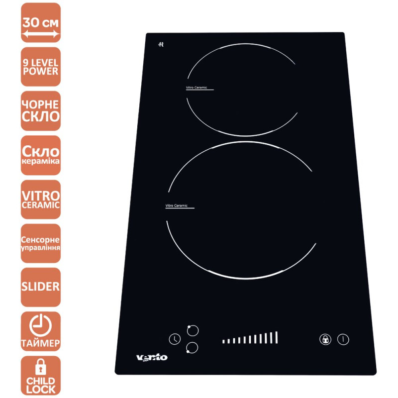 | Характеристики конфорок | Велика 200 мм - 1,8 кВт, середня 165 мм - 1,2 кВт |