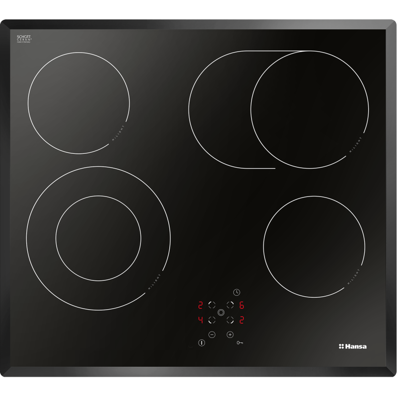 | Діаметр і потужність конфорок | Ліва передня: подвійне поле діаметром 12/21 см, потужністю 0.75 / 2.2 кВт Ліва задня: діаметром 14.5 см, потужністю 1.2 кВт Права передня: діаметром 14.5 см, потужністю 1.2 кВт Права задня: овальне поле діаметром 17 / 17х26.5 см, потужністю 1.4 / 2.2 к |