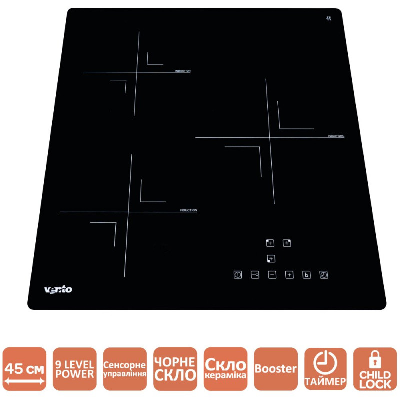 | Особливості | функція BOOSTER для всіх конфорок, дисплей з зазначенням робочої зони нагріву і рівня потужності, збільшення / зменшення потужності конфорки, індикатор безпеки нагріву, замок від дітей, індикатор включення замка від дітей, пауза, таймер |